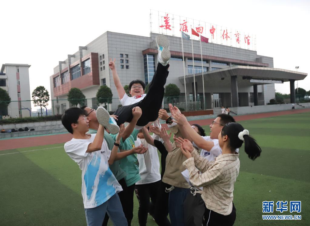 6月9日,在湖南省婁底市第四中學,老三李慶民被同學們拋向空中,慶祝順利完成高考。