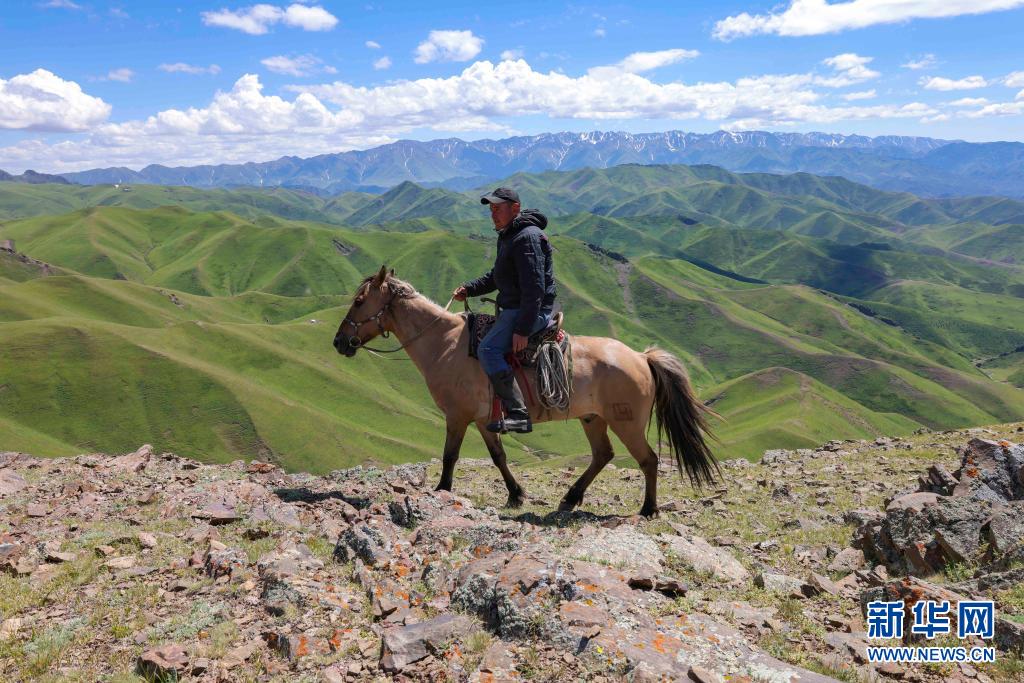 新疆裕民縣的牧民騎馬行進在巴爾魯克山區夏牧場上(6月15日攝)。