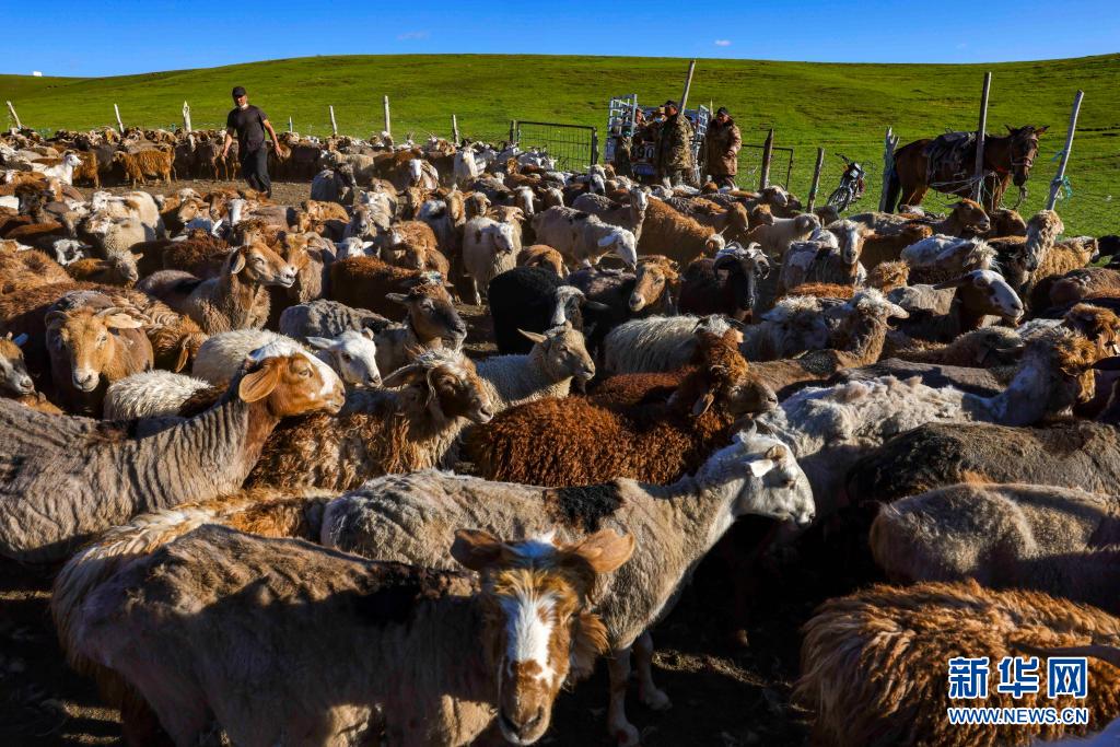 來自縣城的商人在裕民縣巴爾魯克山區夏牧場上收購小羊(6月14日攝)。