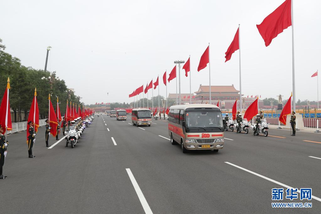 這是“七一勛章”獲得者集體乘坐禮賓車從住地出發,由國賓護衛隊護衛前往人民大會堂。