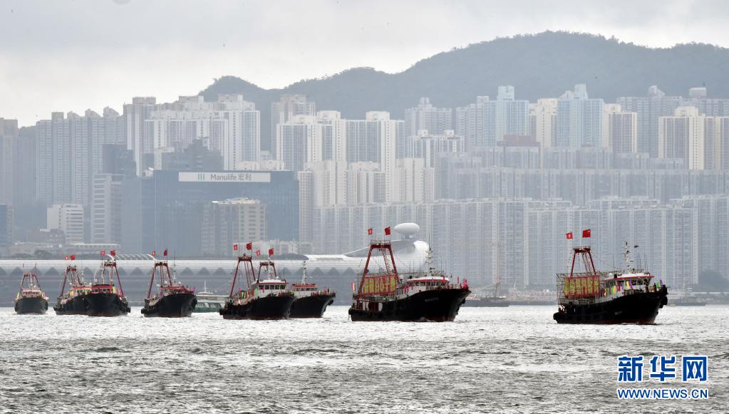 7月1日,懸掛國旗、區旗的漁船在維港巡游。新華社記者 盧炳輝 攝