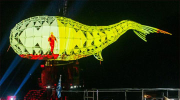 2月9日,在孔子博物馆举行的山东文物精品展上拍摄的山东省文物考古研究院收藏的大汶口文化云雷纹彩陶釜。