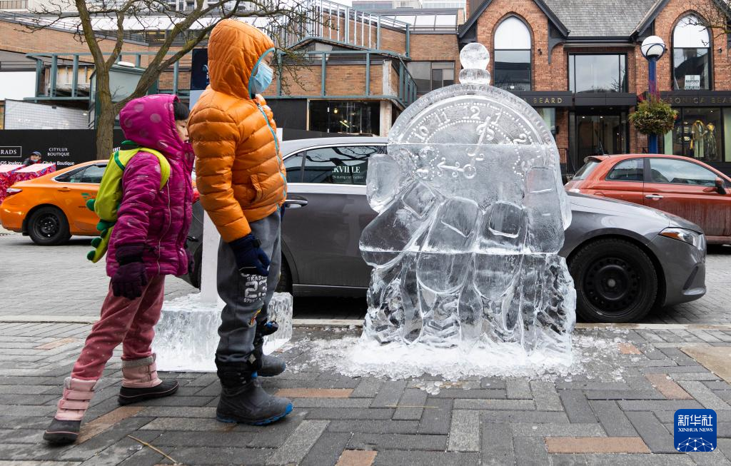 2月18日,人们在加拿大多伦多街头观赏冰雕作品。