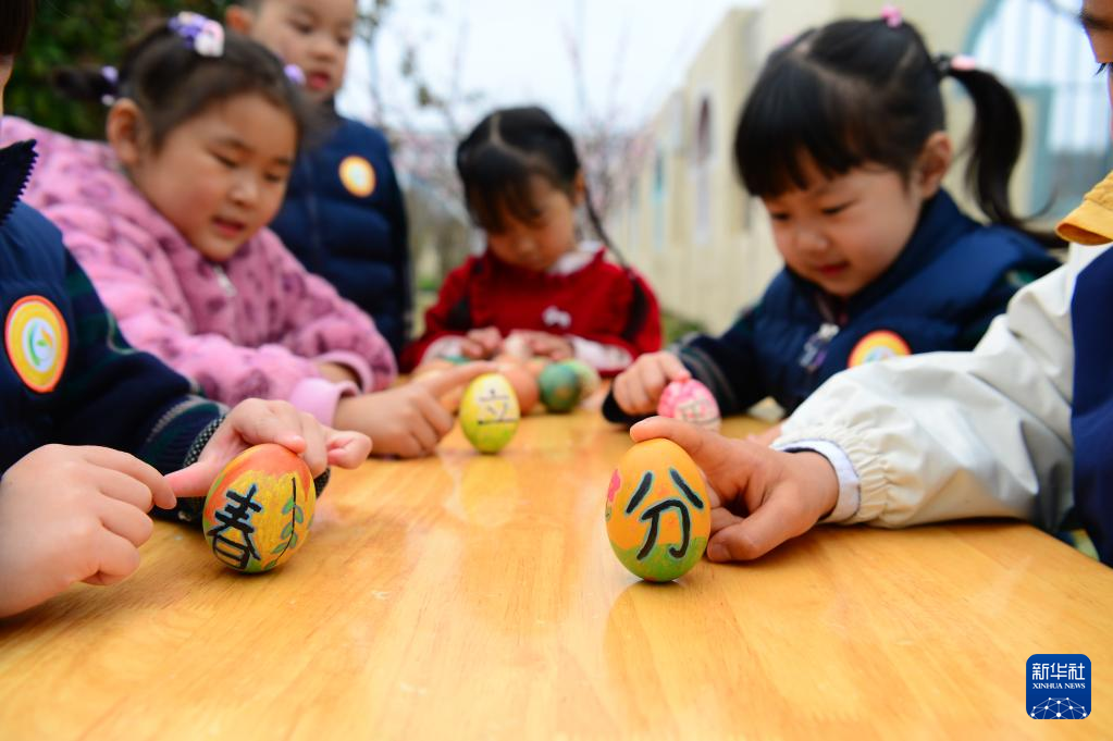 3月20日,江苏省无锡市阳山中心幼儿园的小朋友在玩“立蛋”游戏。