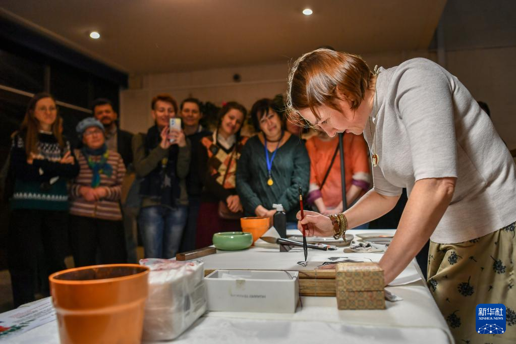 3月30日,人们在俄罗斯莫斯科达尔文博物馆参观中国画和绘画工具。