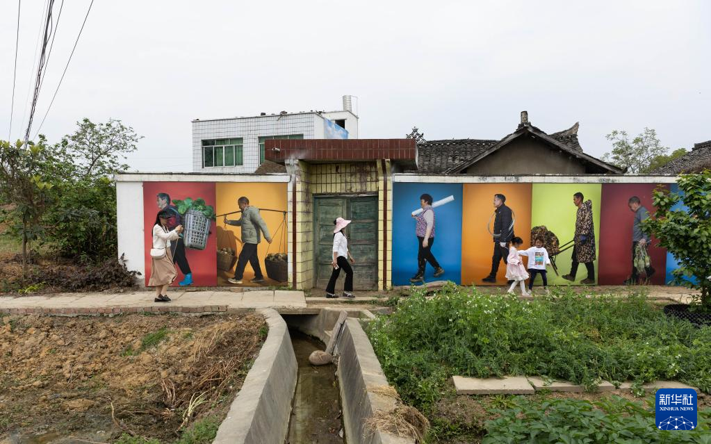 这是在宝胜村村屋墙壁上展出的影像艺术作品(4月1日摄)。