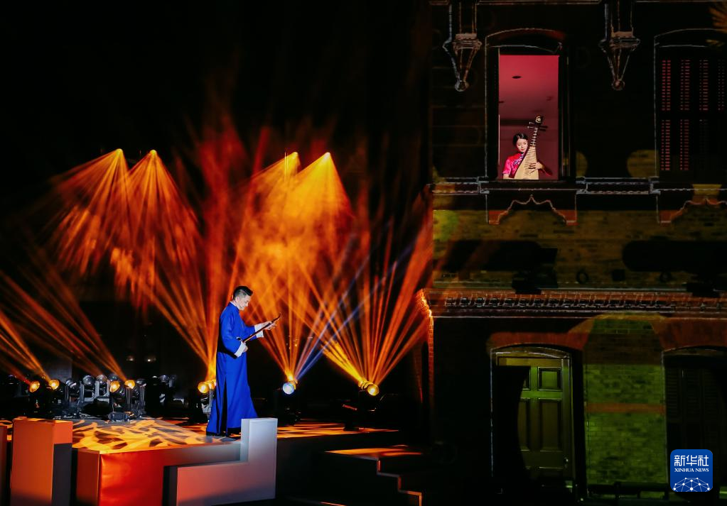 优秀历史建筑“三联排”在声光影效果中,成为如梦似幻的戏曲舞台(4月14日摄)。