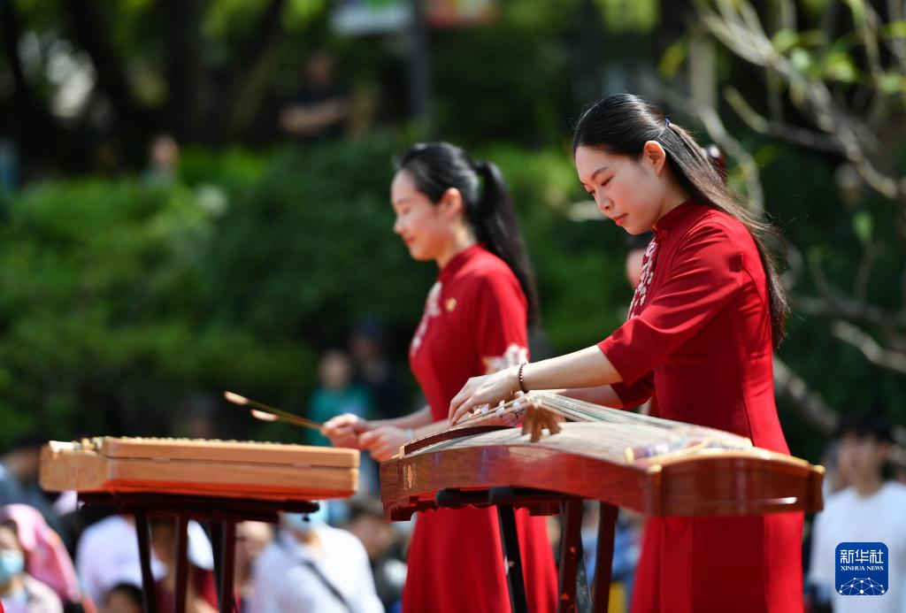 4月15日,演员在2023年福州西湖上巳节启动仪式现场表演中国传统乐器。