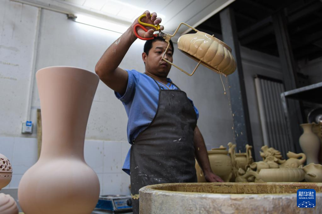 4月13日,在河南省汝州市一家汝瓷生产车间内,工人在为素胎施釉。