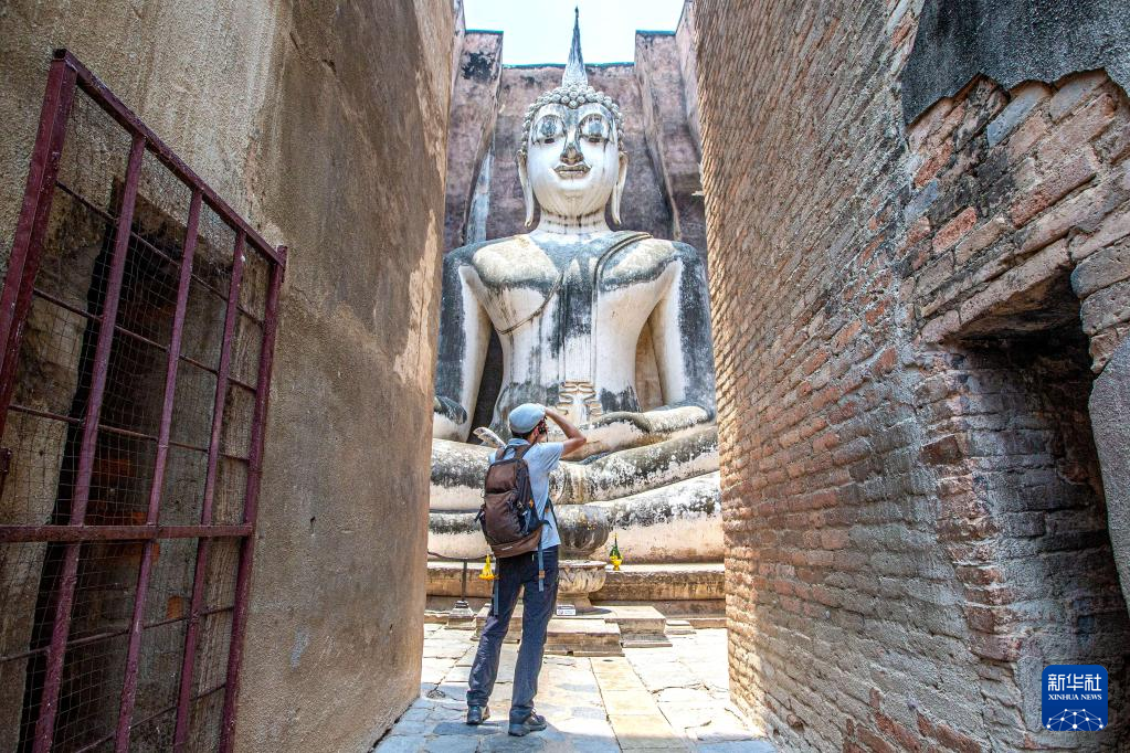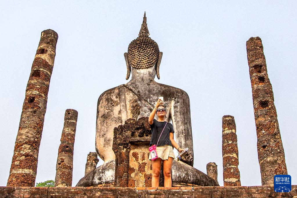 4月17日,游客在泰国素可泰古城遗址拍照。