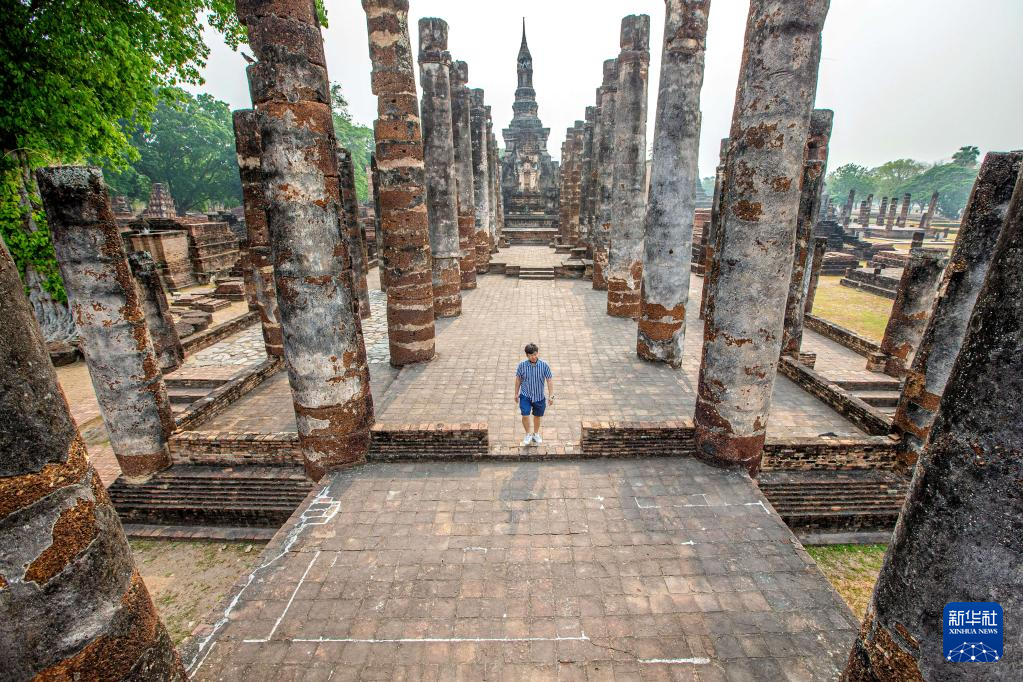4月16日,游客在泰国素可泰古城遗址游览。