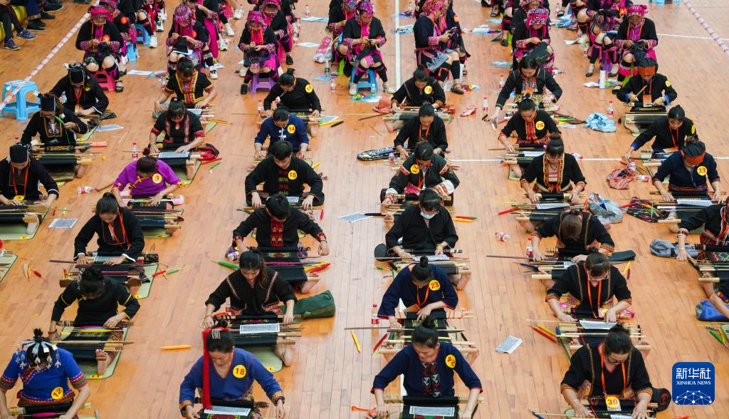 4月23日,在海南省乐东黎族自治县,绣娘在黎锦苗绣技艺比赛现场制作苗绣。