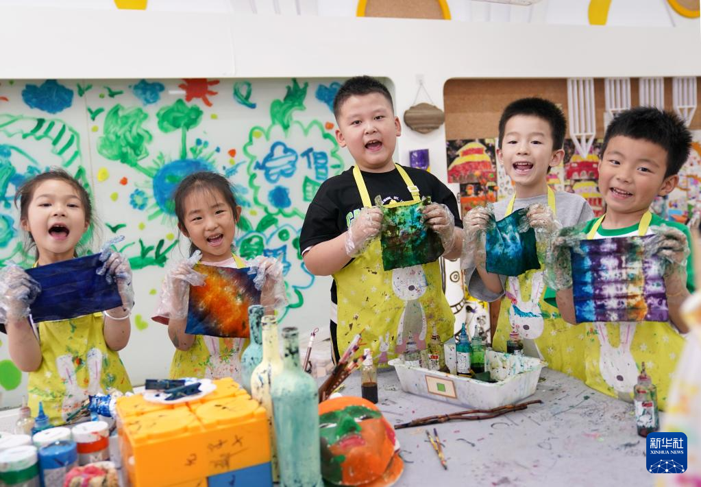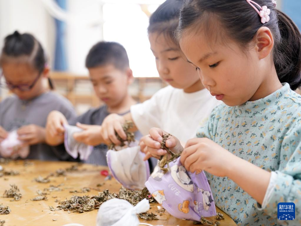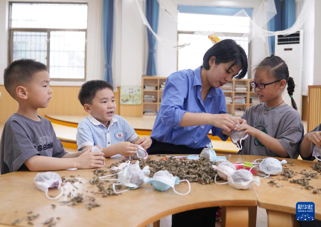 当日,浙江省诸暨市暨北幼儿园举办“夏趣文化节”,孩子们在老师指导下学习体验古法造纸、扎染、做香包等项目,感受传统手工的乐趣。