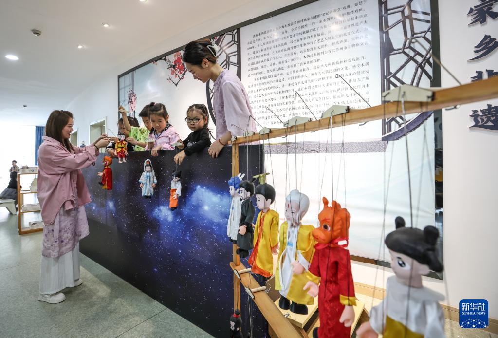 在七都幼儿园,小朋友与提线木偶互动(4月20日摄)。