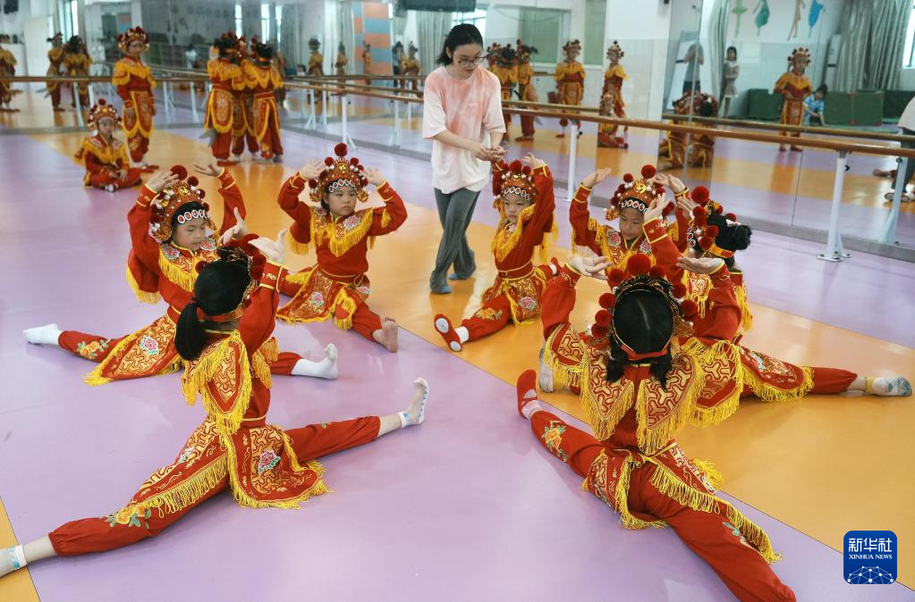 在江西省宜黄县水北新区小学,学生在老师指导下练习宜黄戏基本功(5月25日摄)。
