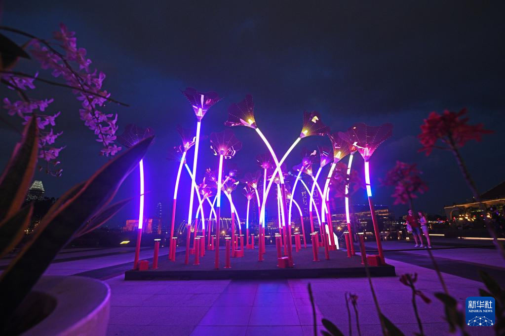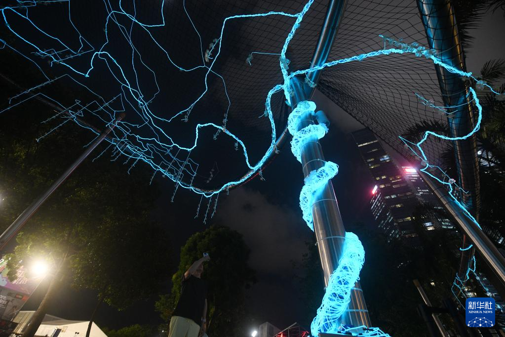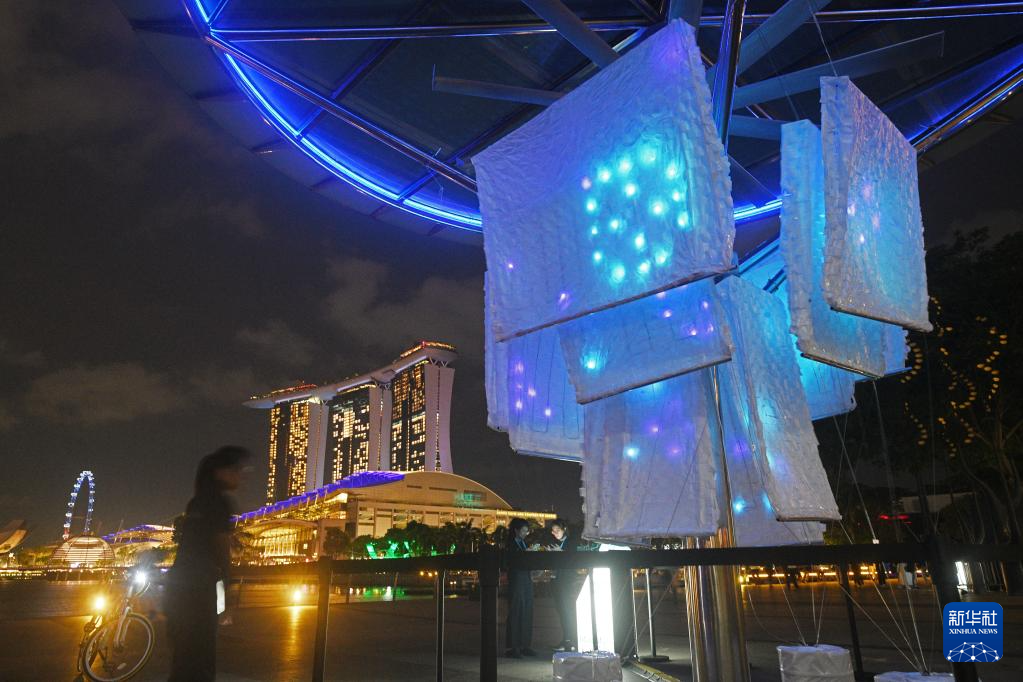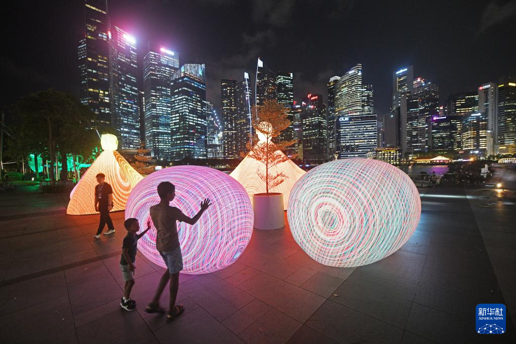 5月30日,市民在新加坡滨海湾观看《照亮新加坡》灯光艺术装置展。