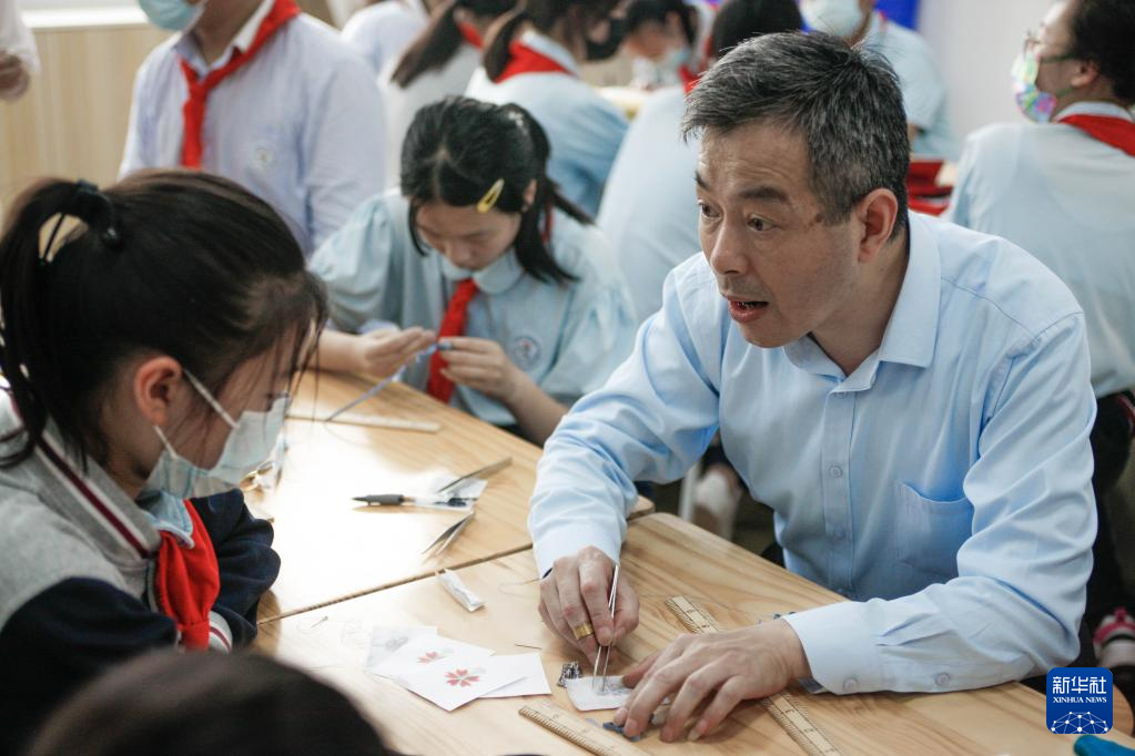 5月30日,张钦玮(左)在上海市青云中学教学生做盘扣。