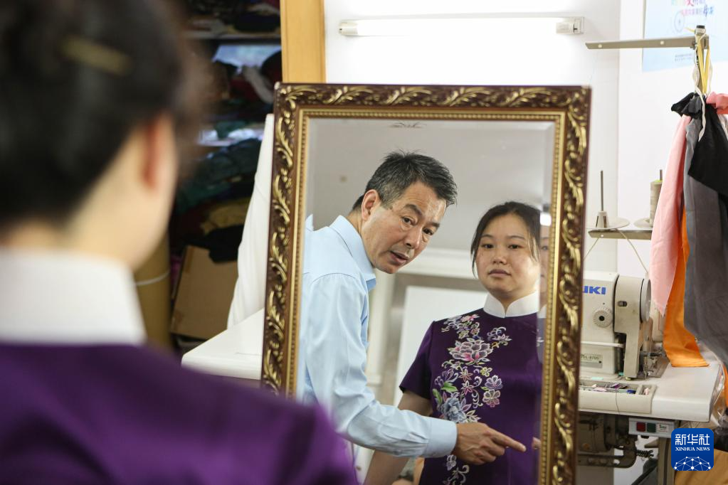 5月31日,江满宗(左)在上海市“龙凤旗袍制作技艺——国家级非物质文化遗产传习所”为顾客测量身材尺寸。