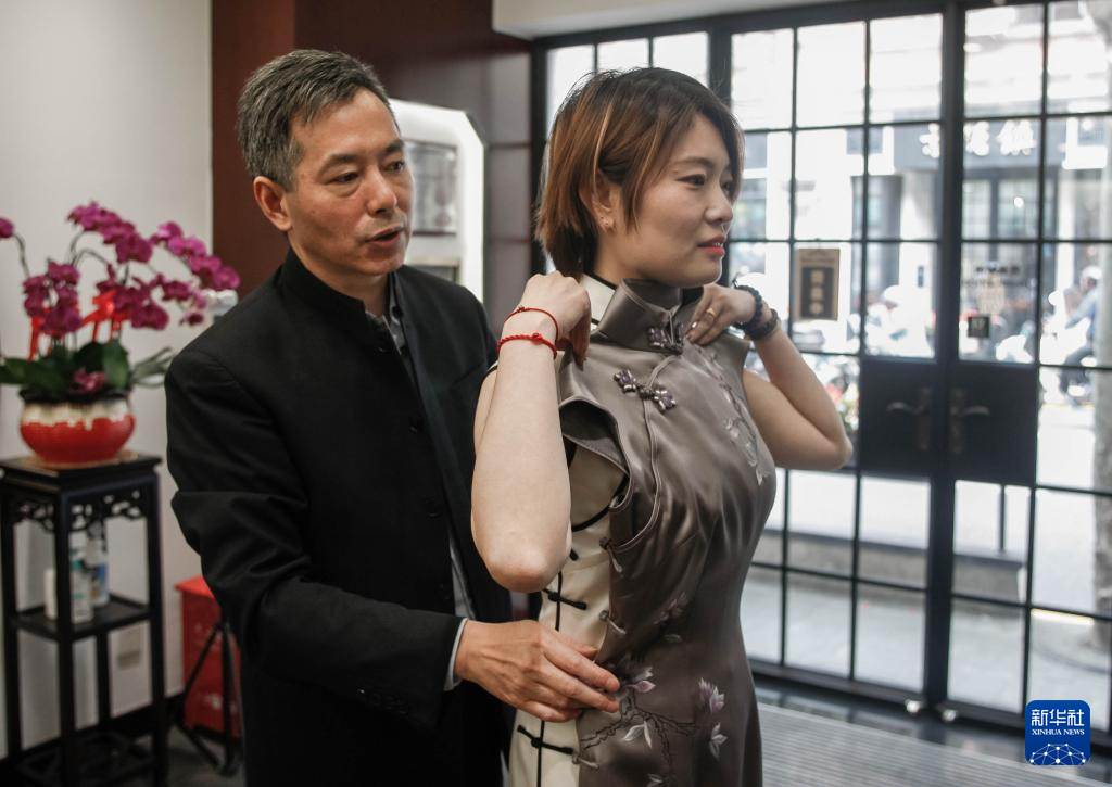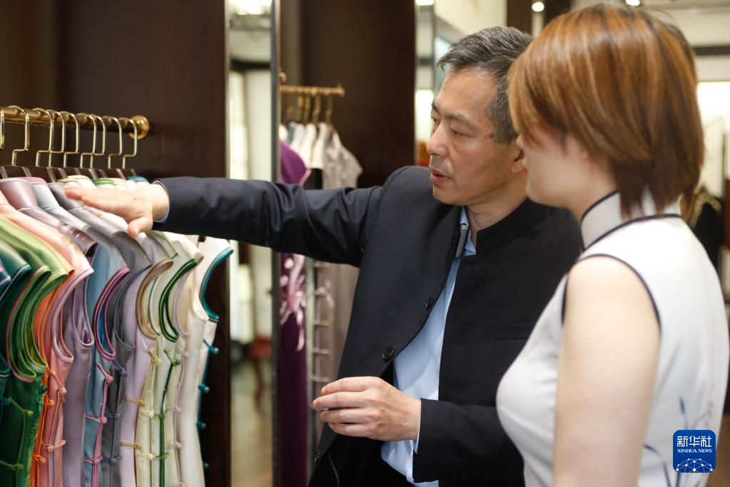 5月30日,江满宗(左)在上海市“龙凤旗袍”门店为顾客挑选旗袍。