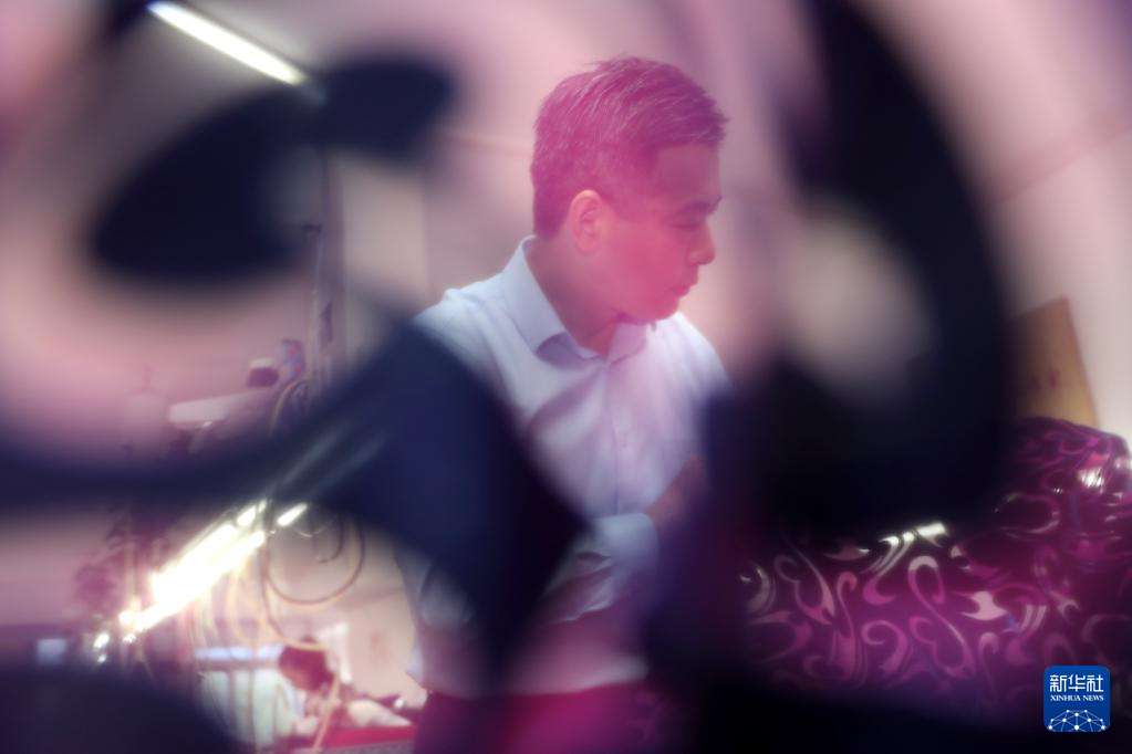 5月31日,江满宗在上海市“龙凤旗袍制作技艺——国家级非物质文化遗产传习所”检查布料。