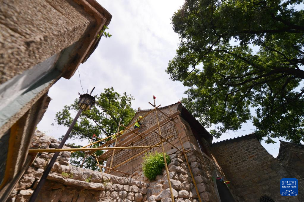 6月7日,施工人员在河北省石家庄市井陉县小梁江村进行古建筑修缮。