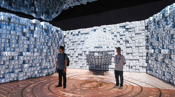 6月8日,在“文旅消费馆·一带一路国际馆”甘肃展台,一位身着古装的观众在观看数字敦煌展览。