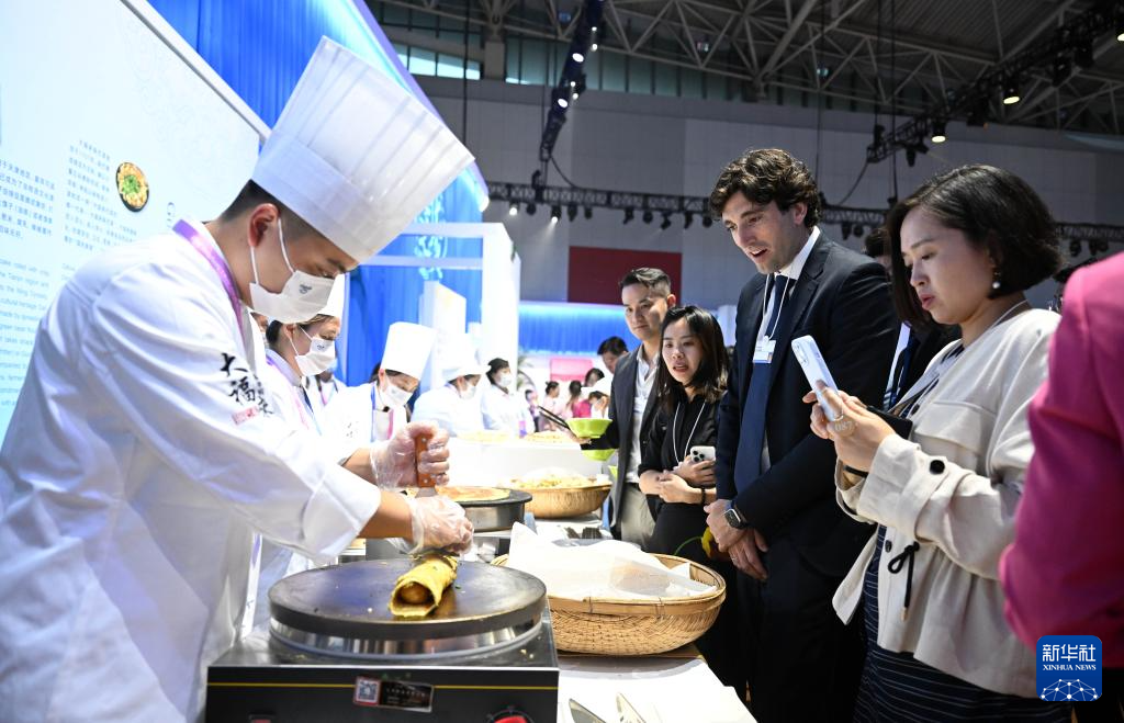 6月27日,与会嘉宾在第十四届夏季达沃斯论坛文化之夜现场了解天津特色美食。