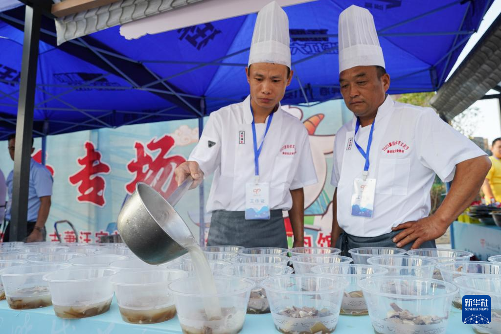 7月11日,在安徽省宿州市萧县水墨圣泉古镇广场,厨师分装羊汤。