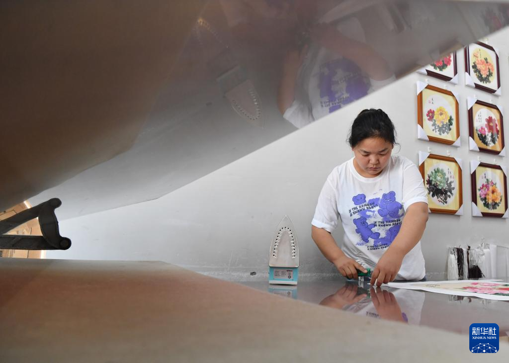 7月26日,工作人员在平乐社区的牡丹画创意产业园区工作室内装裱牡丹画。