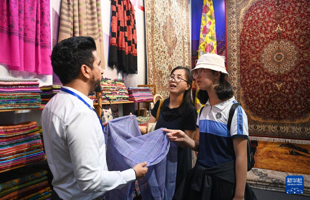 8月17日,参观者在交流合作馆吉尔吉斯斯坦展区了解特色商品。