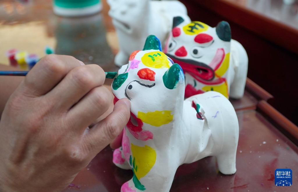 9月5日,在山东省高密市姜庄镇的一处非遗工坊,非遗代表性传承人聂宏希在制作泥老虎产品。