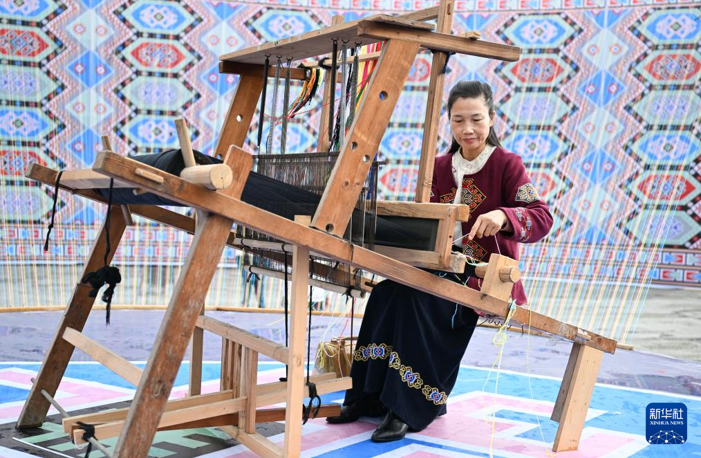 当日,数十名织锦女工在湖北省来凤县龙凤文化中心广场现场进行“西兰卡普”制作,普及非遗文化。