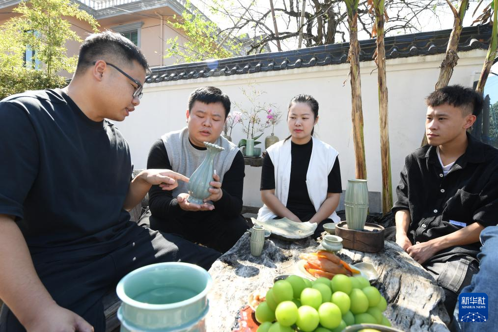 10月31日,在“梅夫人”工作室,季资美(左一)向来访的陶艺家朋友介绍自己烧制的莲瓣纹香炉。