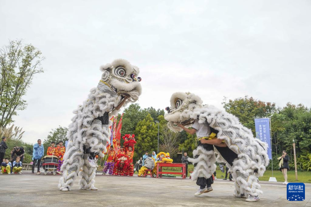 11月11日,在浙江省温州市三垟湿地公园北广场,舞狮队选手在比赛中。
