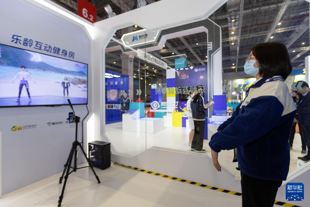11月16日,人们在腾讯展位体验虚拟健身房运动。