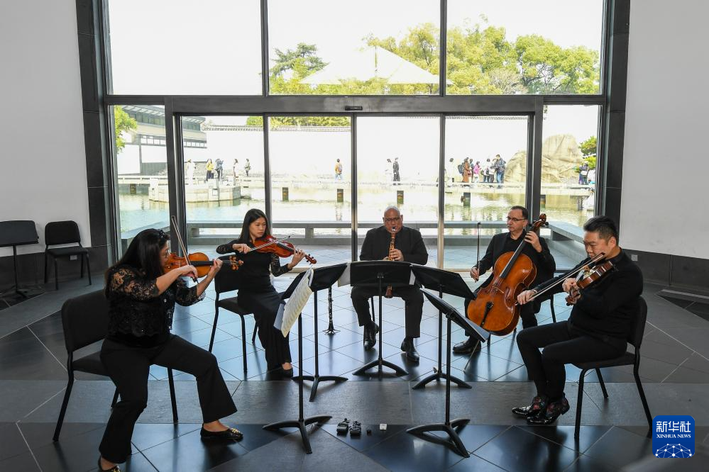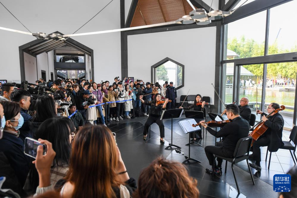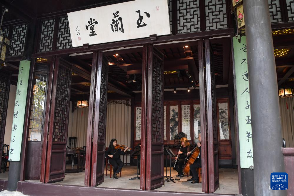 11月16日,来自费城交响乐团的演奏家们在苏州拙政园玉兰堂演奏。