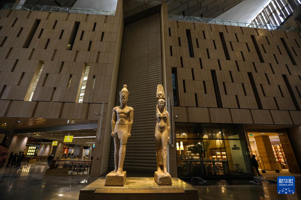 这是11月20日在埃及吉萨省大埃及博物馆大厅拍摄的雕塑。