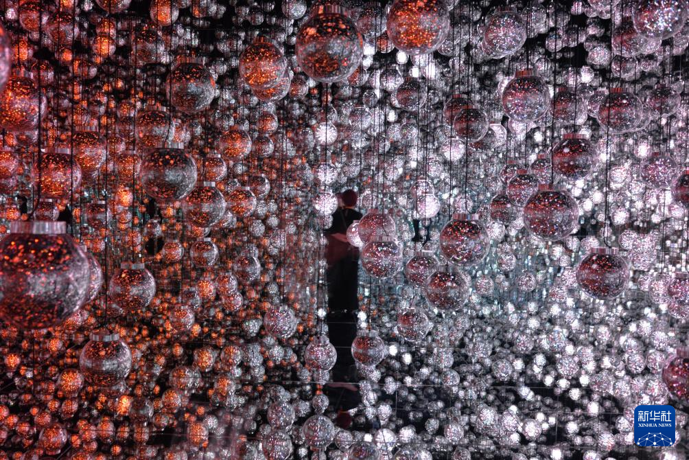 11月20日,在日本东京“teamLab无界”美术馆的媒体预览活动上,参观者体验艺术作品“泡泡宇宙”。