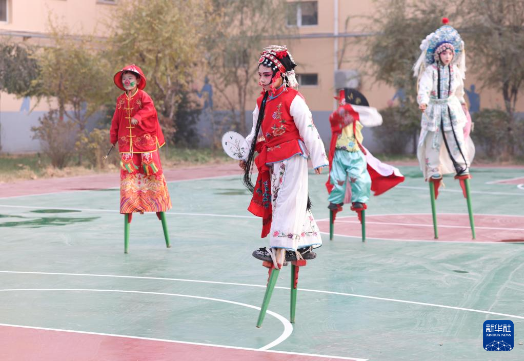 11月22日,河北省霸州市胜芳镇红光小学的学生在排练高跷。