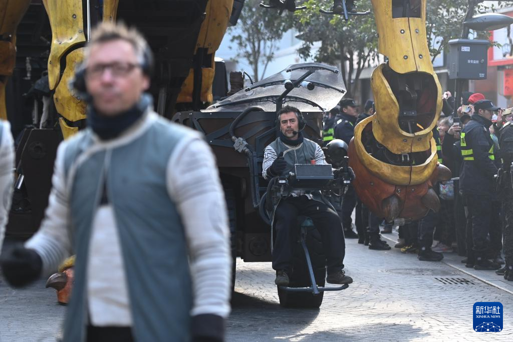 当日,大型机械装置艺术品“龙马精神”来到杭州市拱墅区武林路街区,在10余名工程师的协同操控下巡游,不时向人群喷洒水雾,吸引大批市民和游客驻足观看。