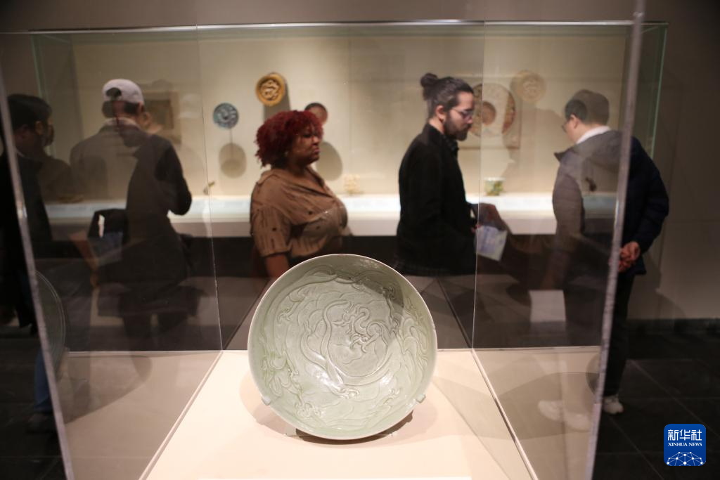 2月3日,在美国纽约大都会艺术博物馆,参观者走过“龙年吉祥”特展上展出的越窑青瓷龙纹碗。