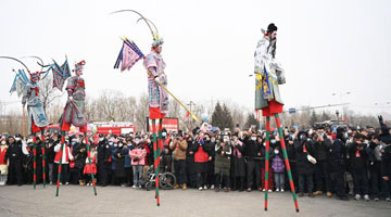 2月21日,海南定安县后山村的村民在村口观看琼剧。