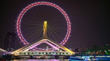 3月28日,游客乘着海河游船游览天津海河沿线夜景。
