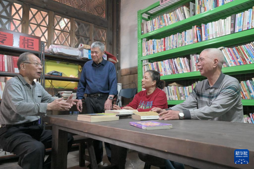 4月20日,书屋管理者陈松年(左一)等在“台屿农家书屋”交流探讨农家书屋的经验与做法。