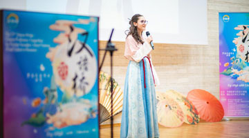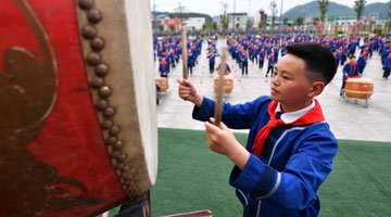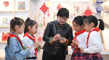 5月1日,“小小讲解员”在四川省内江市张大千博物馆为游客义务讲解。