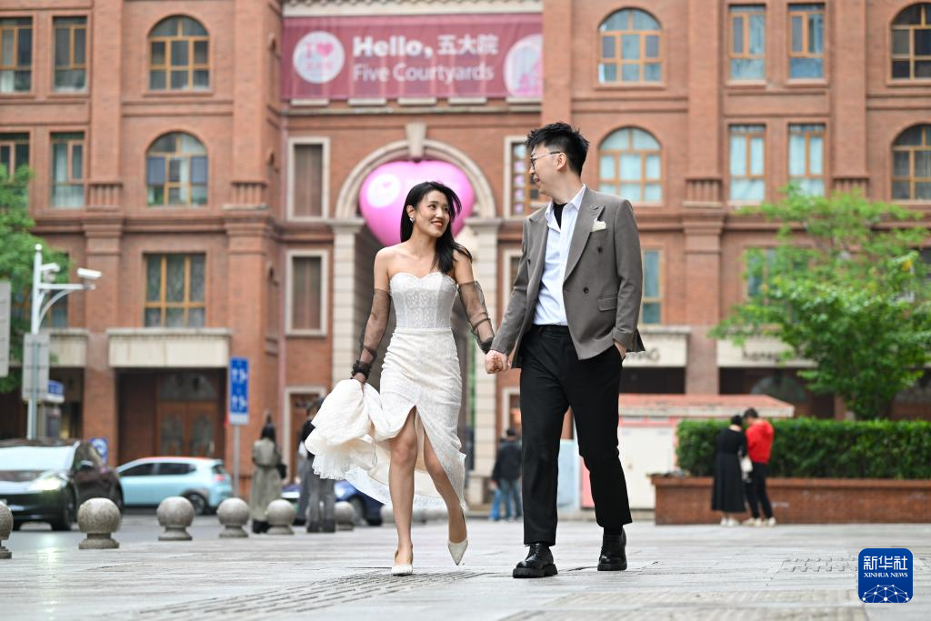 一对恋人在解放北路历史文化街区的欧式风格建筑前拍摄婚纱照(5月5日摄)。