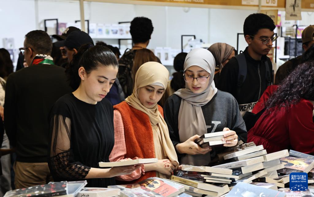 5月11日,人们在摩洛哥拉巴特国际书展的中国展台上选购汉语教材。