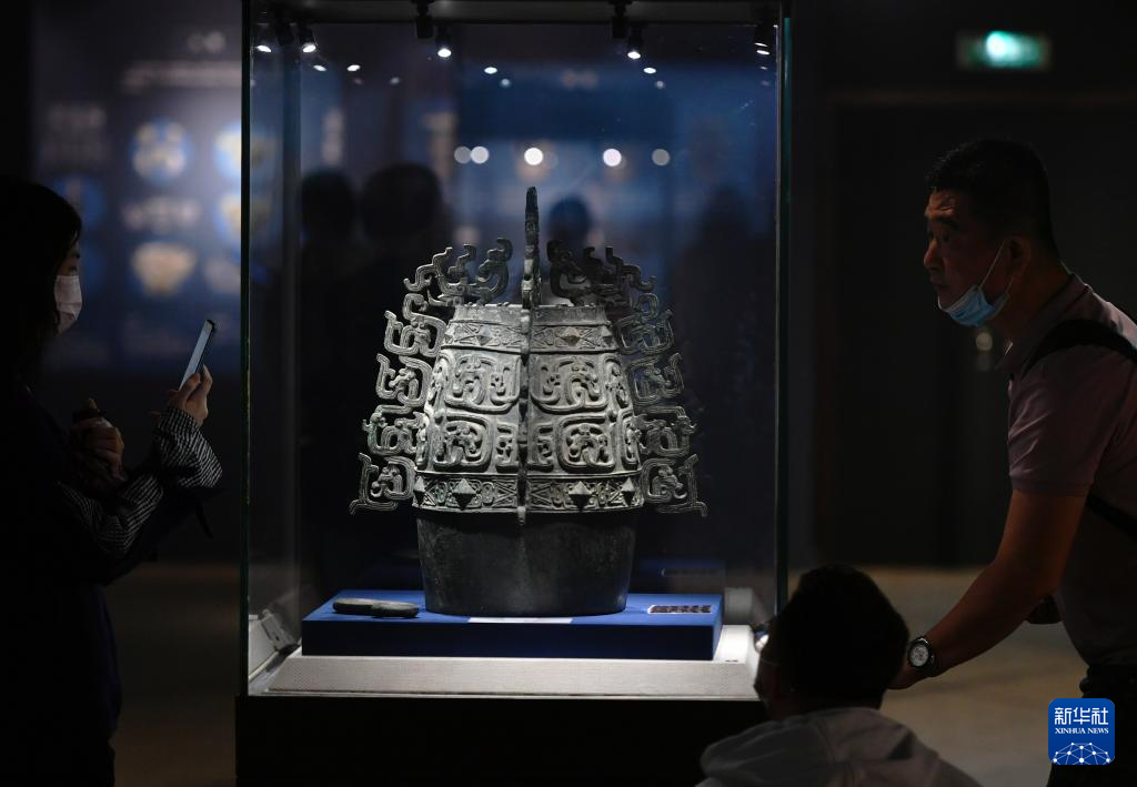 在福建博物院,观众在观赏宝鸡青铜器博物院藏的秦公镈(2022年5月12日)。