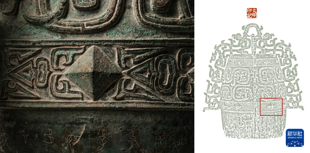 拼版照片,左图:秦公镈(一号镈)“钲”部装饰条带局部和突出的菱形“枚”特写(2024年1月23日摄);右图:左图画面在镈身位置示意图(红框内)。