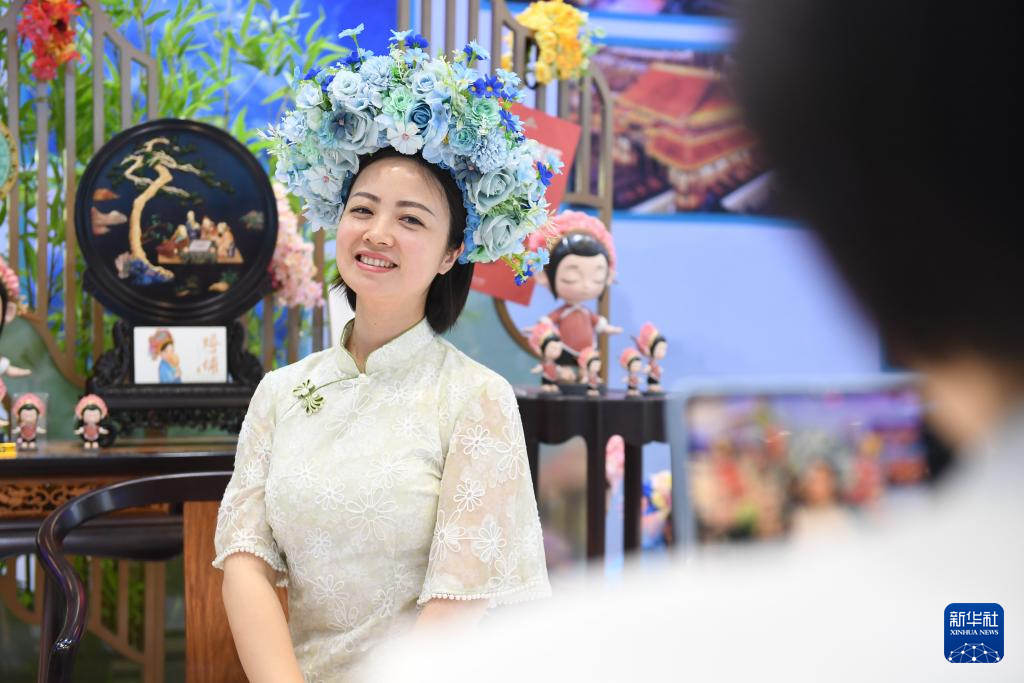 5月23日,参观者在第二十届文博会福建馆体验簪花。